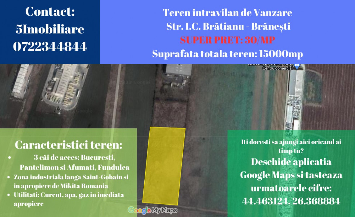 Iti propunem acest teren situat in Branesti cu acces rapid catre Autostrada Bucuresti-Constanta.